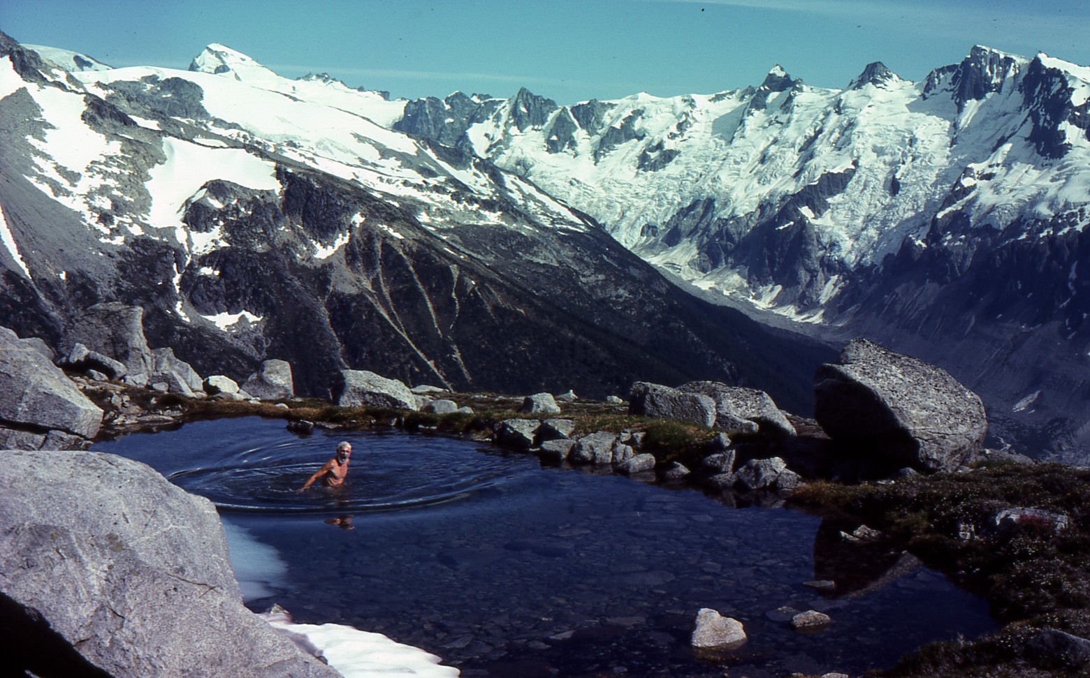 John Clarke swims in a tarn, circa 1980s. Photo: John Baldwin.